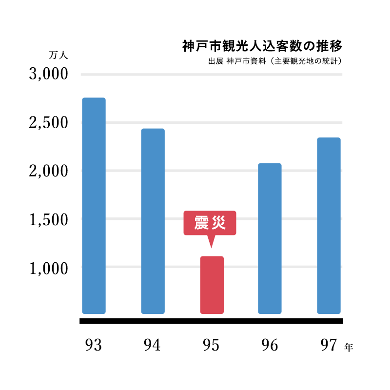 震災の影響を大きく受けた1995年度の神戸市の観光人込客数