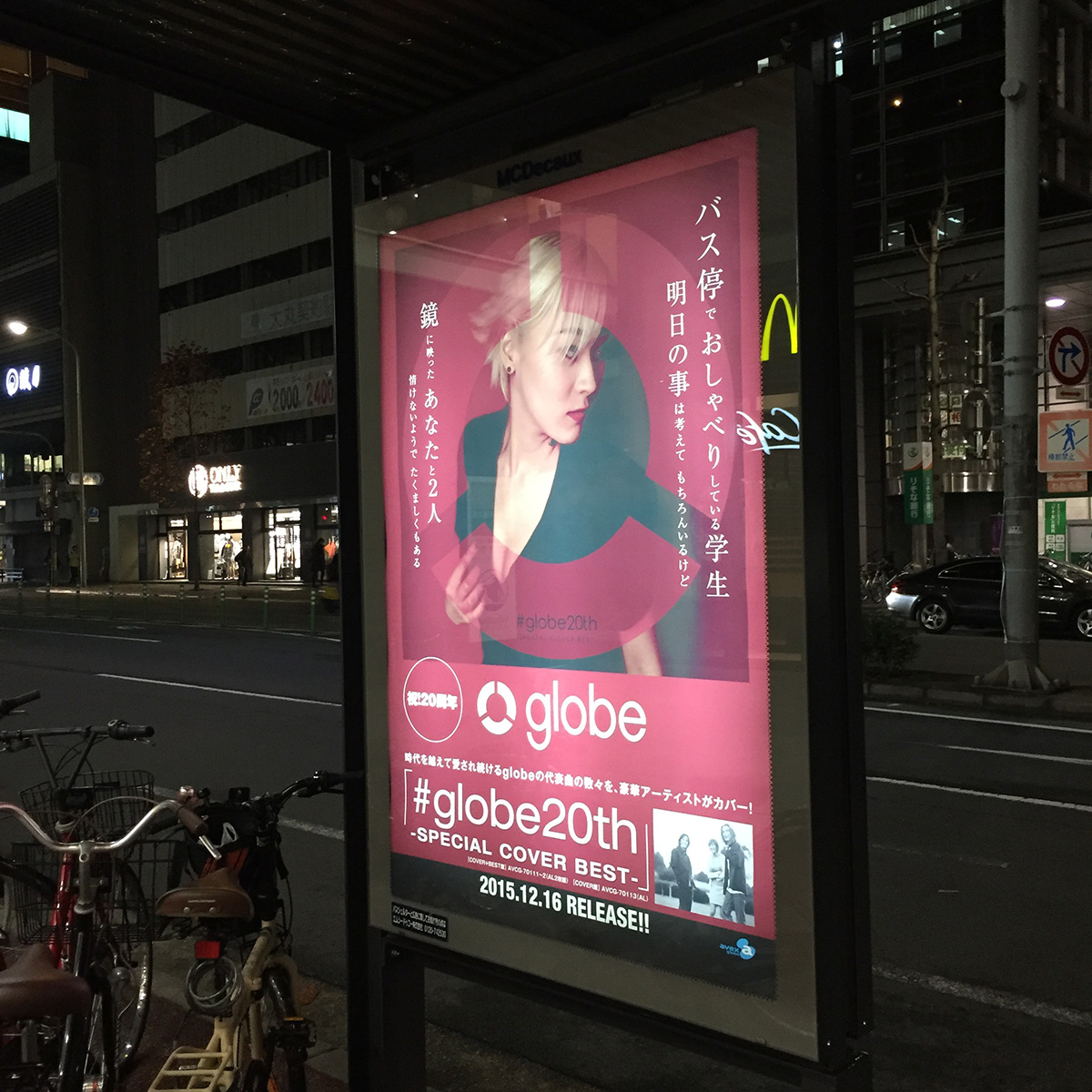 ちょうど1年ぐらい前だったかな、Globeのアルバムのプロモーションでバス停にポスターが貼られていたんです。そこには宣伝文句として「Face」という曲の歌詞から「バス停でおしゃべりしている学生 明日の事は考えて もちろんいるけど」「鏡に映ったあなたと2人 情けないようでたくましくもある」という箇所が抜粋されていました。バス停の広告スペースがガラス張りなので、立ち止まってこのポスターを見ることで、そこにお喋りしている学生が写っていたり、そこに写った自分たちの姿を見たりすることになるわけです。その姿が曲の歌詞とシンクロして…とてもウィットに富んだ広告でした。