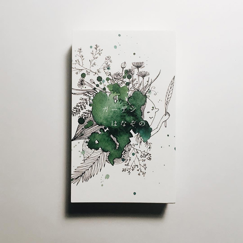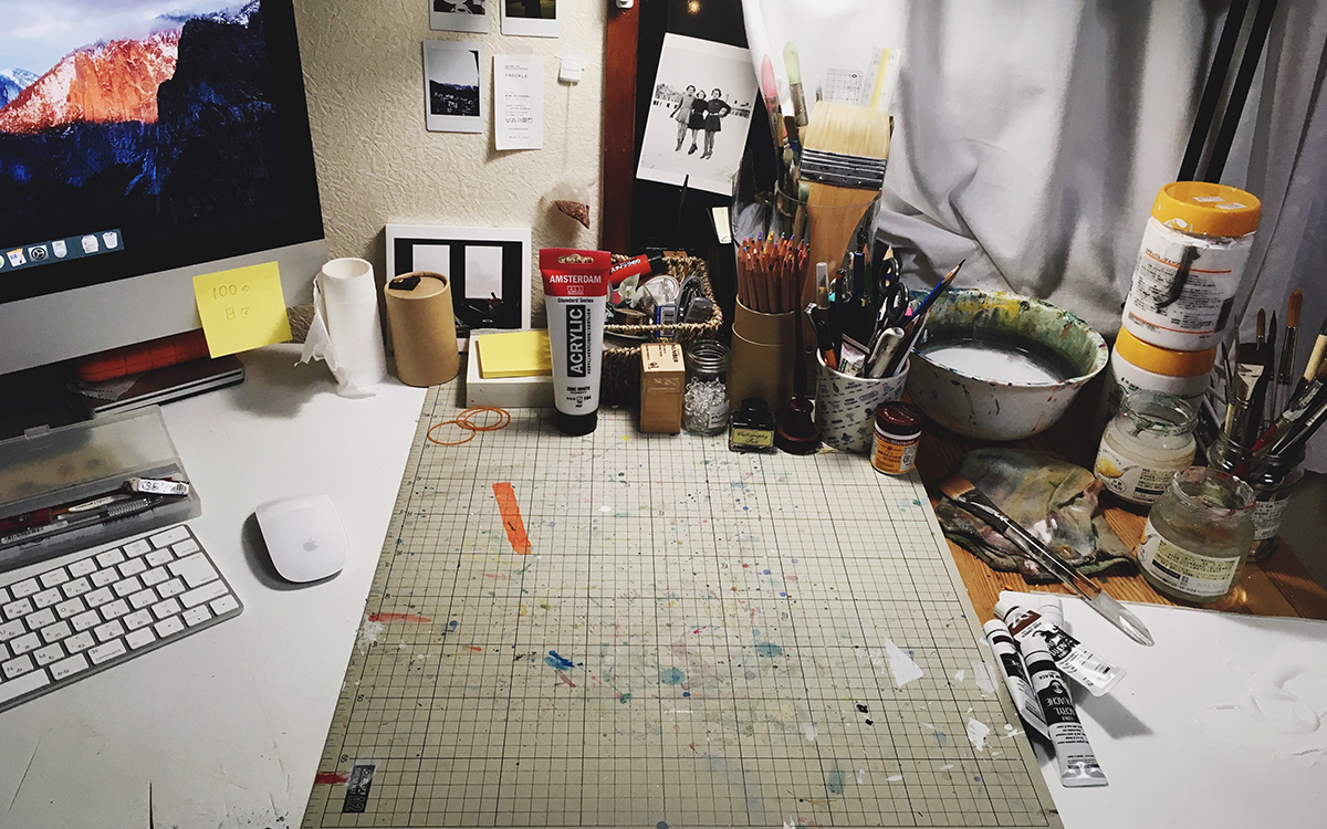 制作はもっぱら学校のアトリエか家でやることが多い。家には必要な画材をひと通り揃えてあるので、急な仕事が入った時にもなるべくすぐ対応できるようにしている。基本的に、名刺制作や部屋に飾るための絵画制作の仕事が多いが、バンドのCDジャケットのデザインをしたり、ウェブコラムの挿絵を担当したりもしている。どの仕事の場合も常に心がけているのは、“独りよがりなものづくりはしない”ということ。依頼してくれた方がどういうイメージで、どんなものが欲しいのかをなるべく理解した上で、わたしができる中でいちばん素敵だと考えるものを提案したい。要するに、相手に喜んでもらえるものをつくるということだ。このような考えは、大学に入ってから学んだ。“デザインとは、常に目的があり、誰かをしあわせのためにするものだ”と。