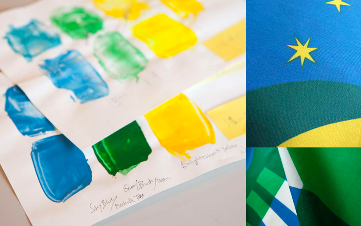 色に関しても、園に自生する植物の緑や空の青、そして希望と精神性を示す黄色も含め、色の重なりの効果も吟味しながら、パレットのうえに再現していきました。