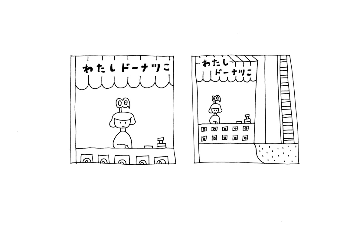 20代前半の失敗を機に、自分が方向音痴であることを自覚し、「目標を持つのはもうやめよう。これからは目的地のない散歩をするようにやって行こう」と決めた私は、いつの間にかイラストレーターの仕事をするようになり、ある時編集長Uさんの一言をきっかけに、突然絵本をかき始めたのであった。そして、初めての絵本らしき不可解なもの『きみと かんでんちと さみしい』のボツを経て、人生2作目の絵本『わたしドーナツ』を、どうやら出版してもらえることになったのだ。