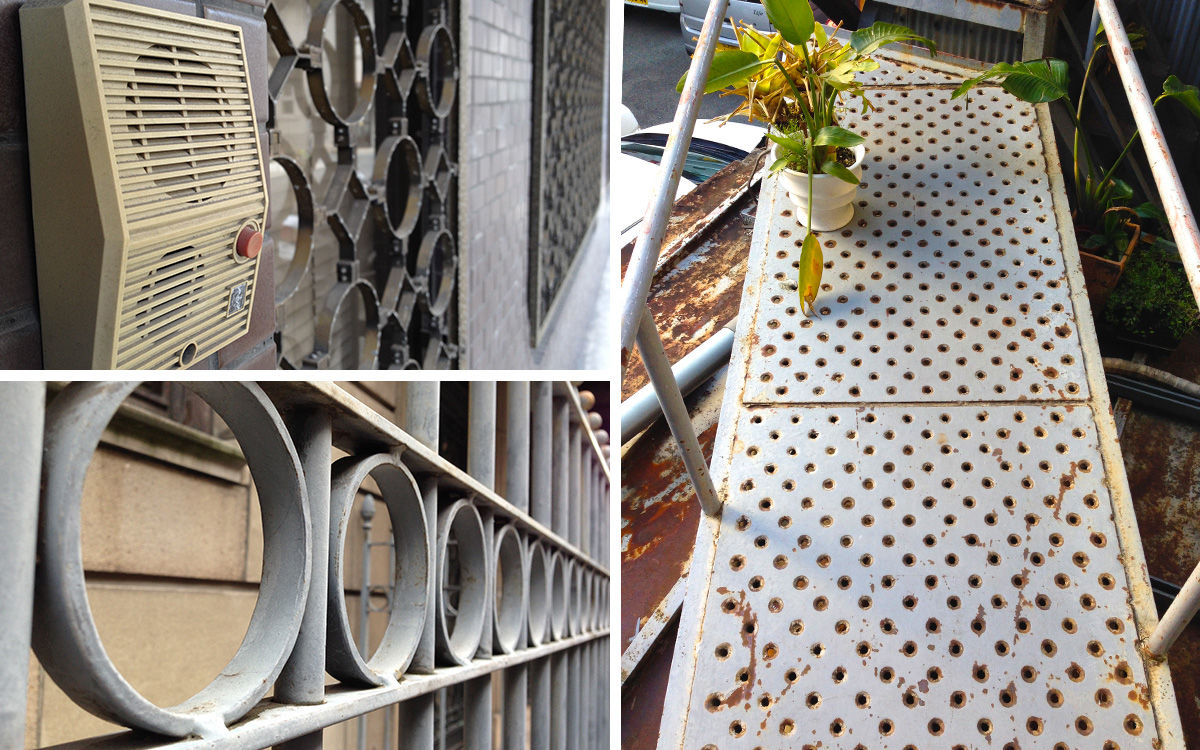 左上:大阪ニット会館のインターホンと格子 / 左下:どこかの柵