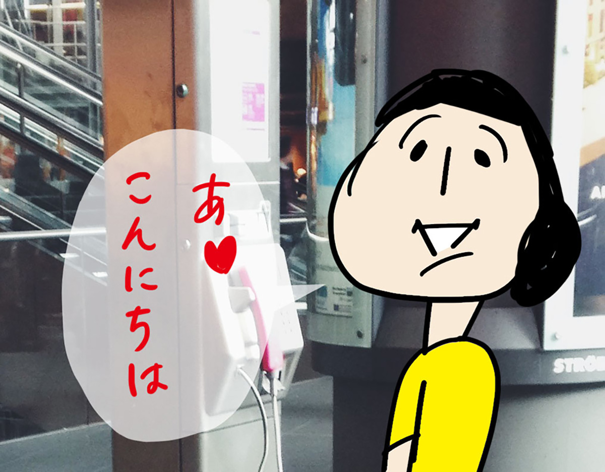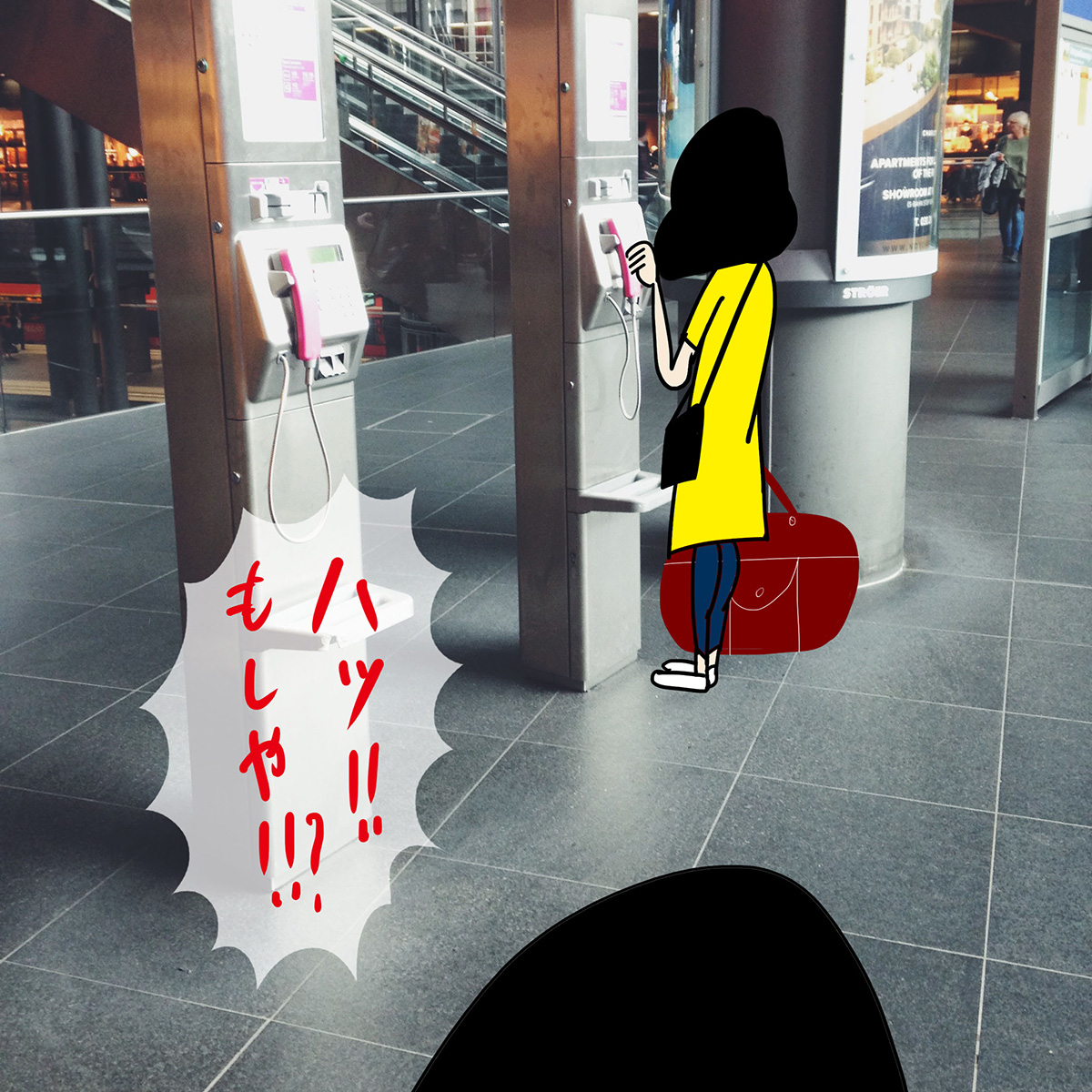 向かったところは到着ホームから上がった場所にある公衆電話。するとアジア人女性らしい後ろ姿を発見!