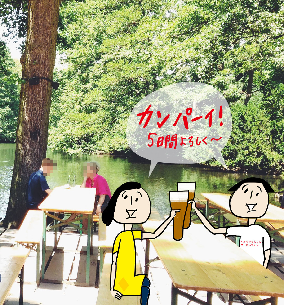 日本からのお客さまを迎えてベルリン案内をするオカッパさん。思いがけないトラブルもありましたが、“Siegessäule(戦勝記念塔)”や“Tiergarten(ティーアガルテン)”など、ベルリンの名所をご案内して、ひとまず到着を祝ってドイツビールで「Prost!!(乾杯)」。