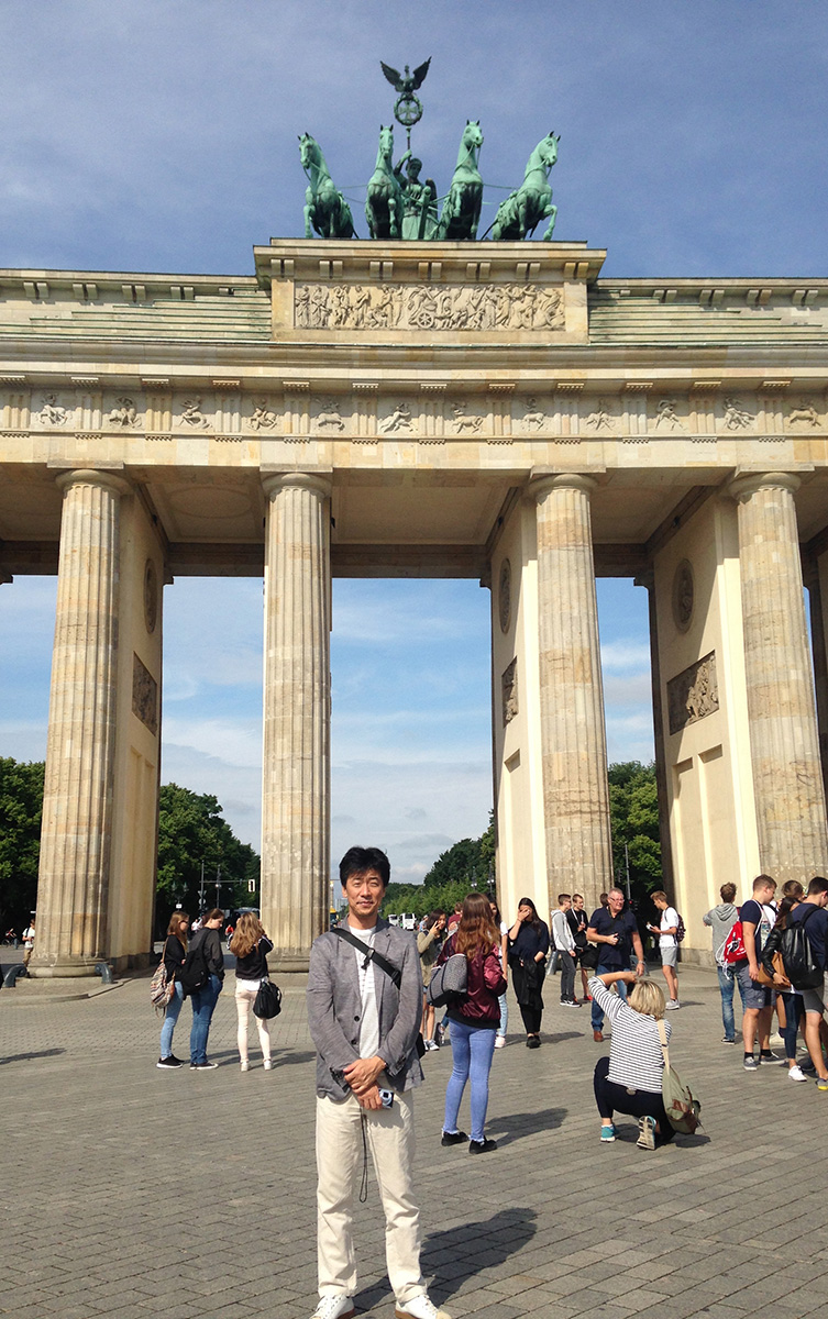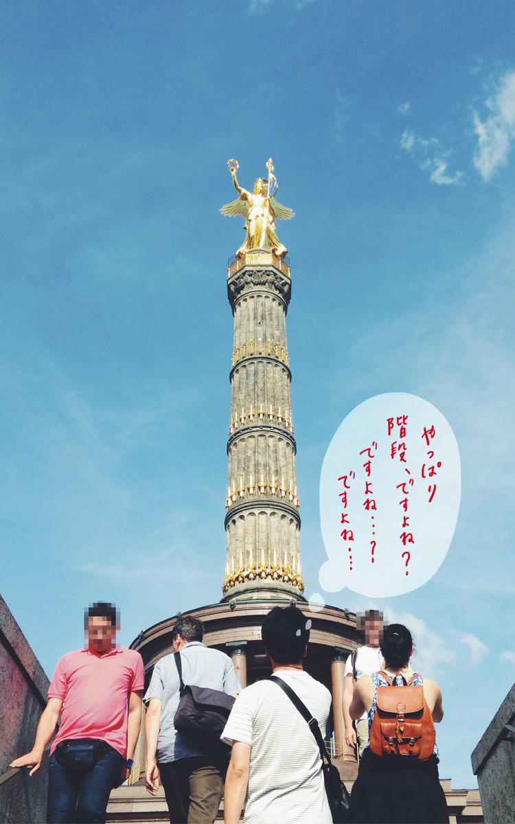 特に印象に残っているのは映画『ベルリン・天使の詩』(編集部注:ヴィム・ヴェンダース監督の1987年の映画)でも有名な戦勝記念碑の黄金の天使の足元からブランデンブルク門側を望む眺めでした(戦勝記念碑を目指して階段をのぼる写真)。
